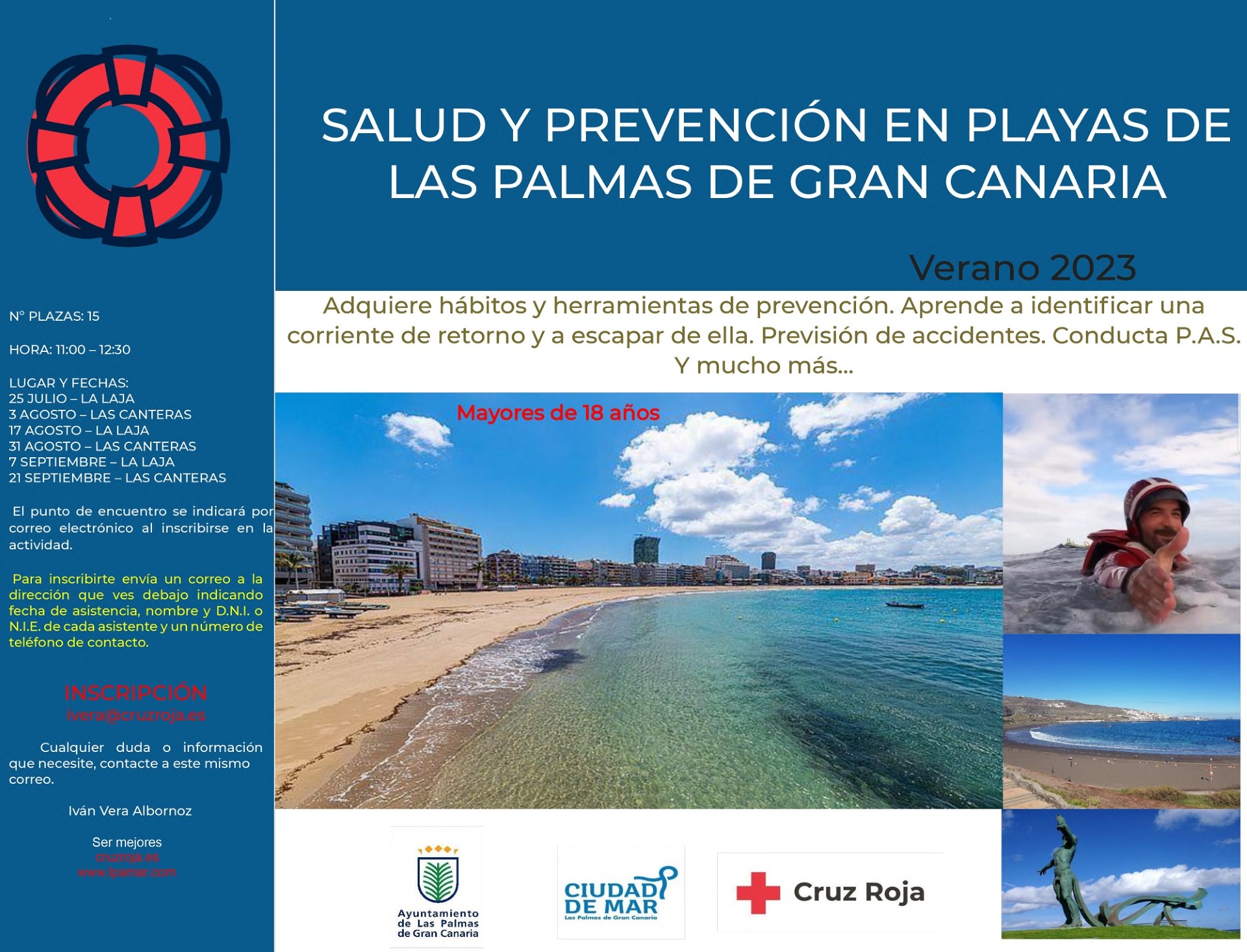 El ayuntamiento de Las Palmas de Gran Canaria, a través de la concejalía de Ciudad de Mar, y Cruz Roja ofrecerán este verano, a partir del próximo 25 de julio, en las playas de Las Canteras y La Laja, talleres de prevención para disfrutar con seguridad en las playas, dirigidos a mayores de 18 años.