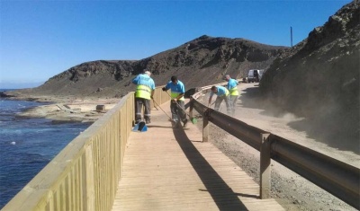 El Servicio de Vías y Obras se encargó además del vaciado de la malla de triple torsión, desde el acceso peatonal (pasarela) hasta el acceso de la playa donde retiraron 13 toneladas de material y se limpió las piedras que permanecían sueltas en el talud – 3 toneladas de áridos. Los operarios ajustaron el cableado y la malla de seguridad que quedó en perfecto estado para cumplir la función de estabilización de talud y evitar desprendimientos. Por último, se soldó 12 chapas de acero en pasarela peatonal de El Confital.