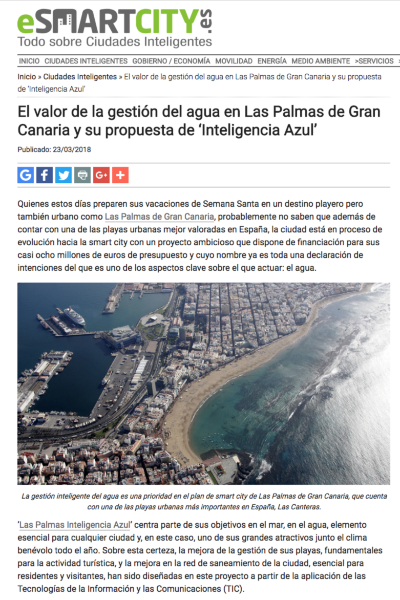 La web especializada resalta que el proyecto ‘LPA Inteligencia Azul‘ centra parte de sus objetivos en el mar, en el agua, elemento esencial para cualquier ciudad y, en este caso, uno de sus grandes atractivos junto al clima benévolo todo el año. Sobre esta certeza, la mejora de la gestión de sus playas, fundamentales para la actividad turística, y la mejora en la red de saneamiento de la ciudad, esencial para residentes y visitantes, han sido diseñadas en este proyecto a partir de la aplicación de las Tecnologías de la Información y las Comunicaciones (TIC).